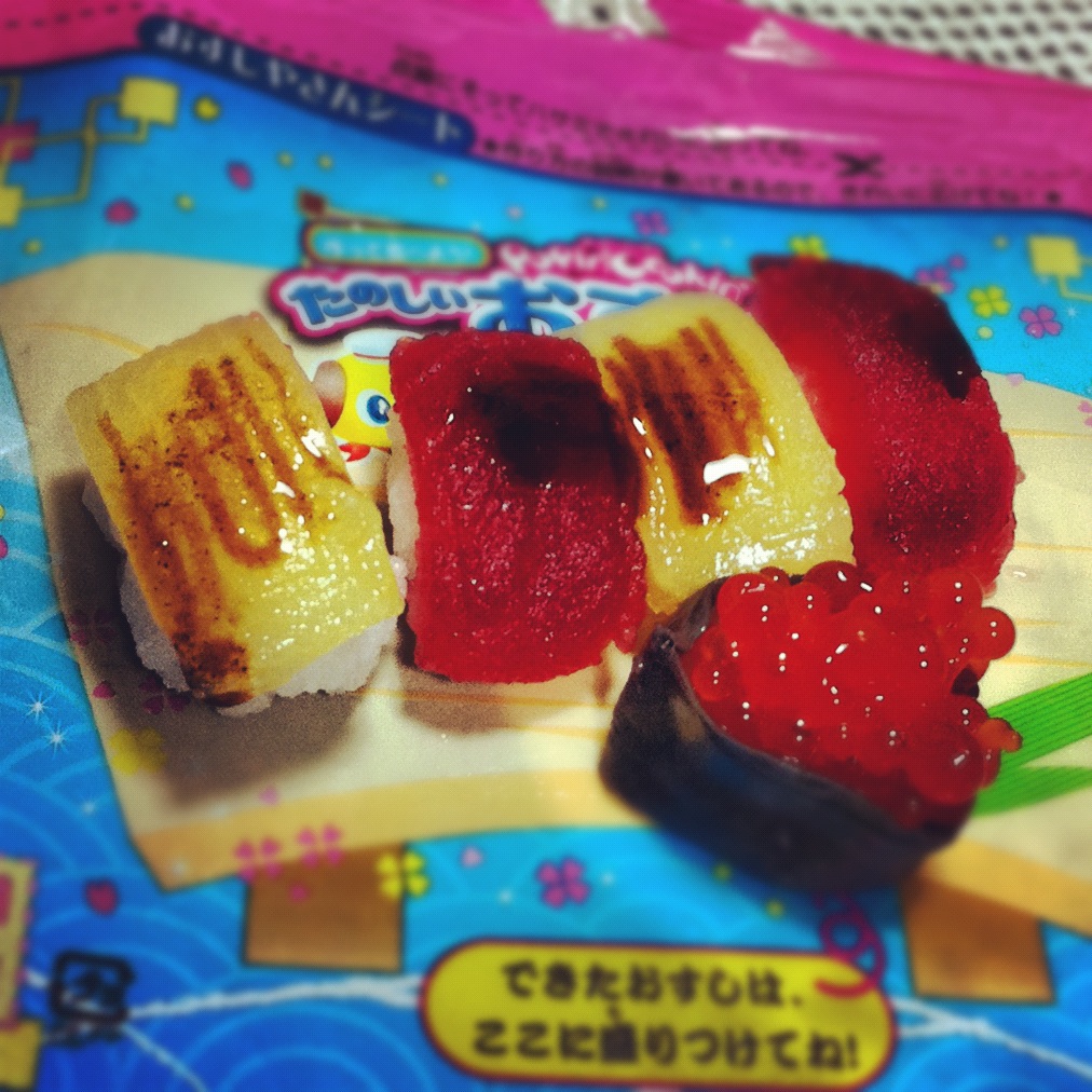 めいっこと作った、お菓子のお寿司☆ なかなかリアルで本物っぽかった!! 今のお菓子ってスゴイ…( ̄(工) ̄)